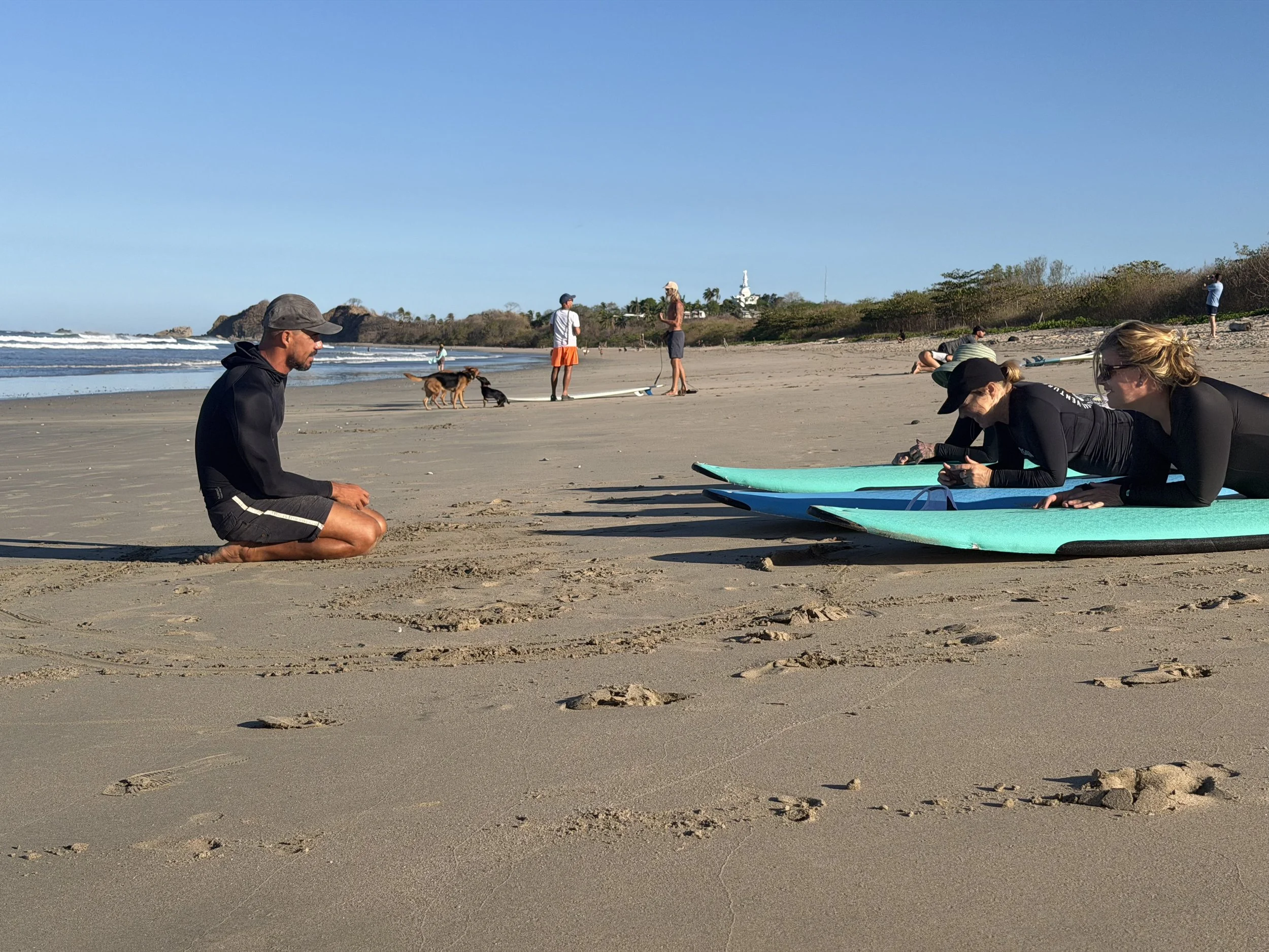 Our Nosara-based coach Oscar Vargas is a Level 2 ISA certified surf coach with 18 years of experience on these breaks. Every morning he read the tides and timed our starts accordingly. We’d meet at his truck, carry our boards to the beach, and gather in the sand where Oscar mapped out the day’s focus - layered, clear, coached progression. No overwhelm. Just building one skill at a time.
